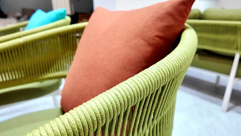 在表面工艺上,SETON系列采用户外专用织绳手工编织,线条流畅且富有肌理感。这种工艺不仅保证了座椅的透气性,让用户在户外休憩时尽享舒适体验,更通过自然灵动的编织纹理,为家具增添了独特的美学韵味。搭配户外专用面料,防水、防污、耐晒性能拉满,久坐舒适且易清洁,完美适配酒店露台、庭院休闲区、高端户外社交空间等复杂户外环境。