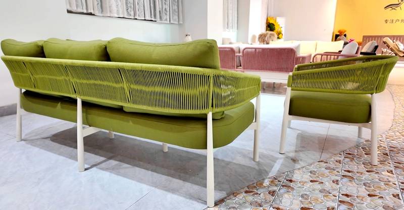 设计层面,SETON系列以简约高级为核心风格,摒弃繁杂装饰,聚焦线条与比例的和谐。其中,锥形桌腿设计堪称点睛之笔,上窄下宽的造型既增强了家具的视觉层次感,又进一步提升了整体稳定性。椭圆餐桌与弧形沙发的柔美元素,中和了铝合金框架的硬朗质感,营造出松弛又精致的户外休闲氛围。色彩搭配上,系列选用清新的绿色调为主,搭配纯净的白色框架,既贴合自然户外场景,又能轻松融入现代、轻奢等多种装修风格,成为点亮户外空间的视觉焦点。(嘉鹏户外家具工厂:136*7021*571*8)
